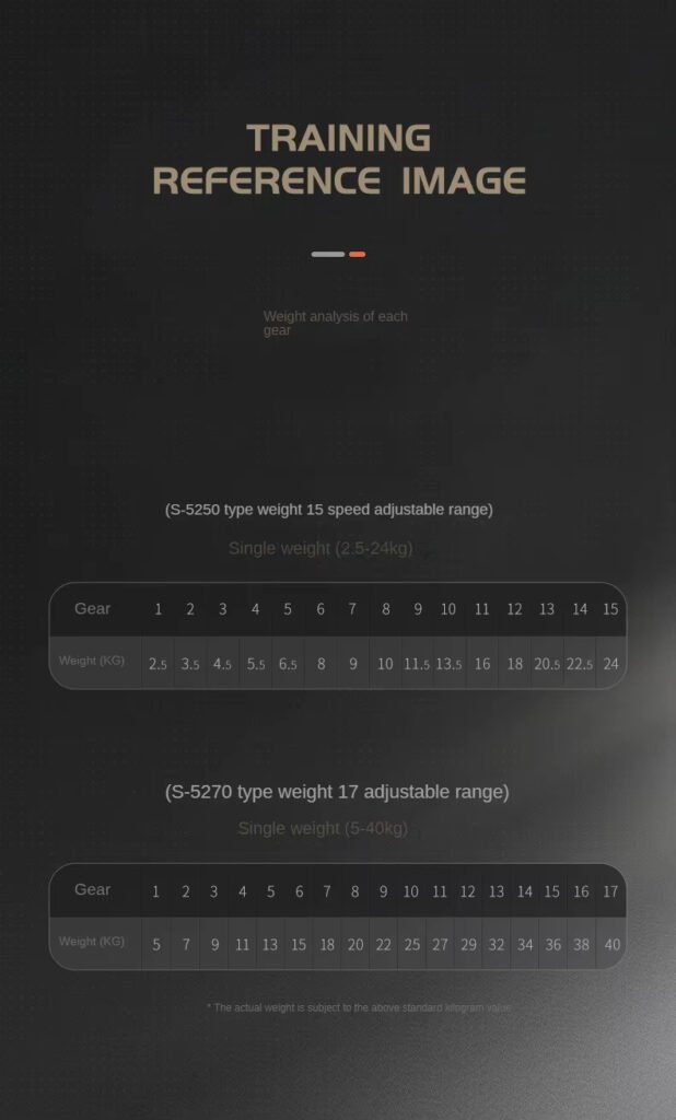 Feature Highlights:New adjustable dumbbells, leading a new trend in fitness. It can be easily adjusted by rotating the dials at both ends, and the weight can be adjusted in 1 second. One adjustable dumbbell = multiple regular dumbbells, no more worries about choosing the right size. The stainless steel dumbbell plates are forged by a special process and will not rust. They have precision structural engagement and the frosted handles are anti-slip. S-5250 type weight has 15 levels of adjustable weight range: single weight (2.5-24 kg). The s-5270 heavy hammer has 17 speeds with adjustable speed range: single weight (2.5-40 kg).