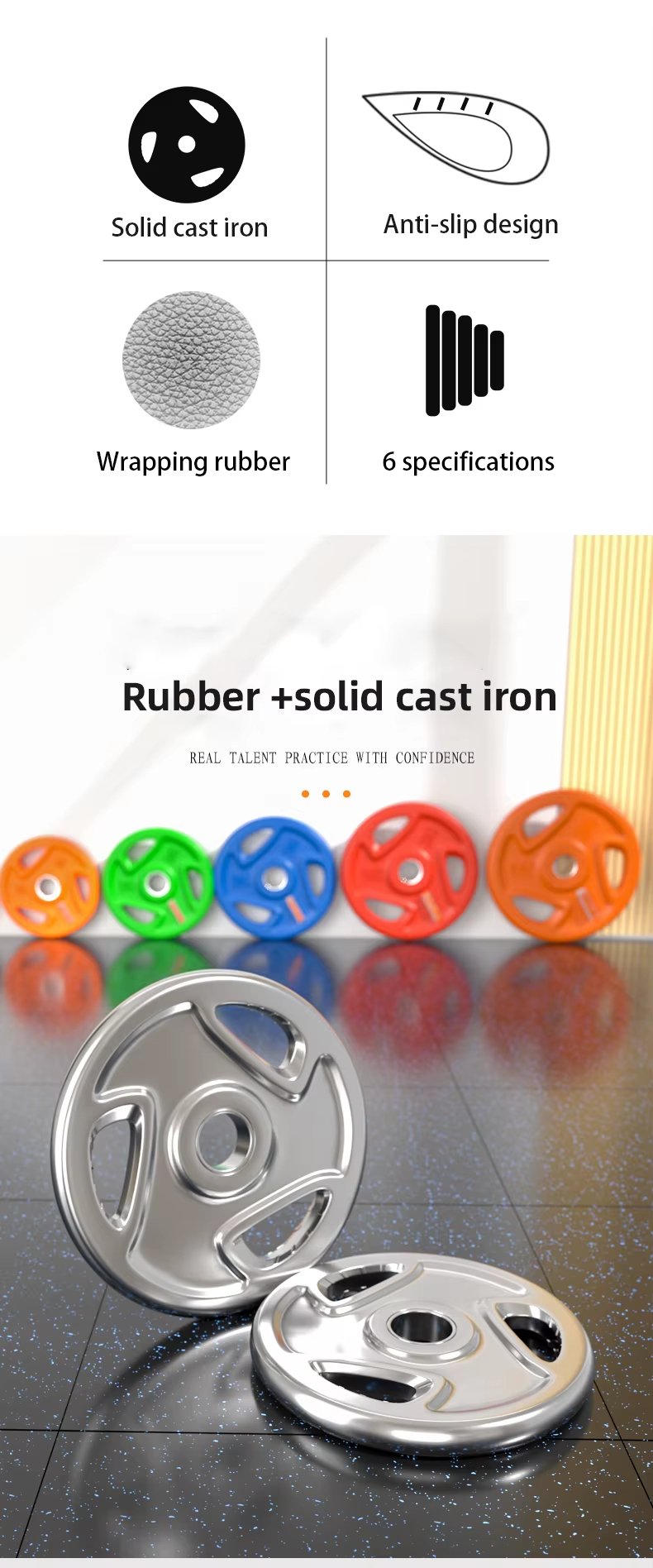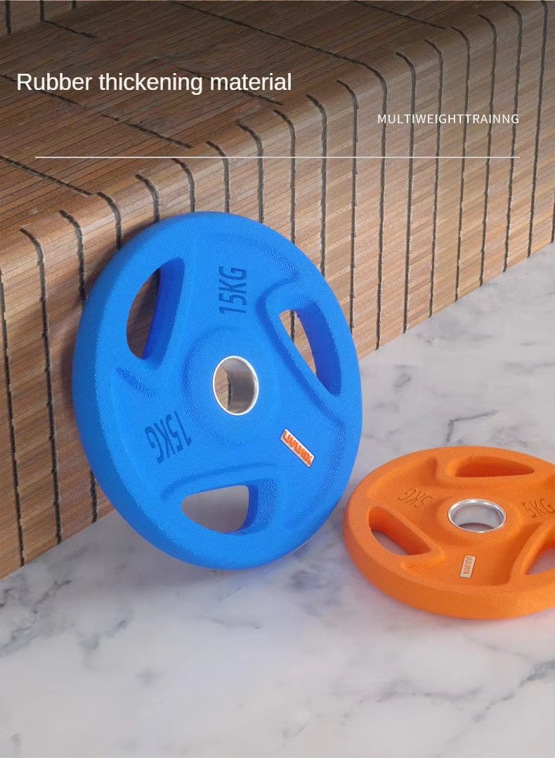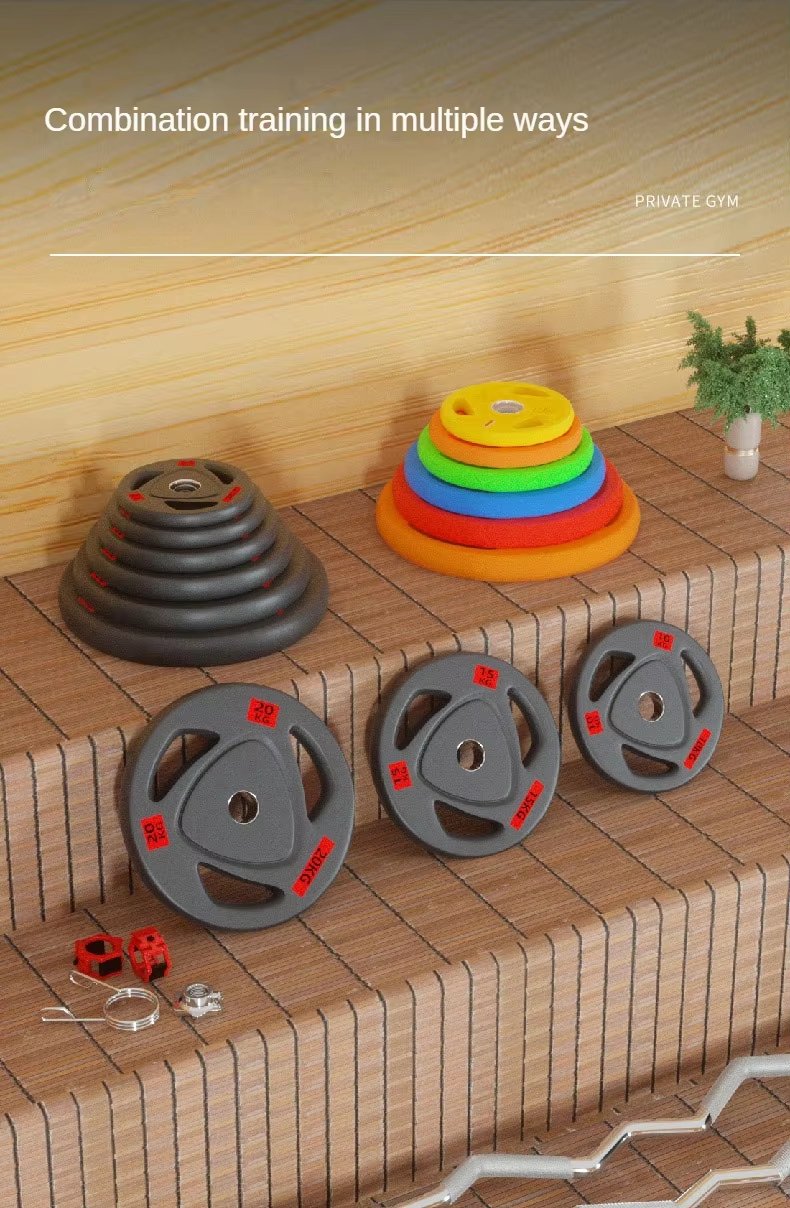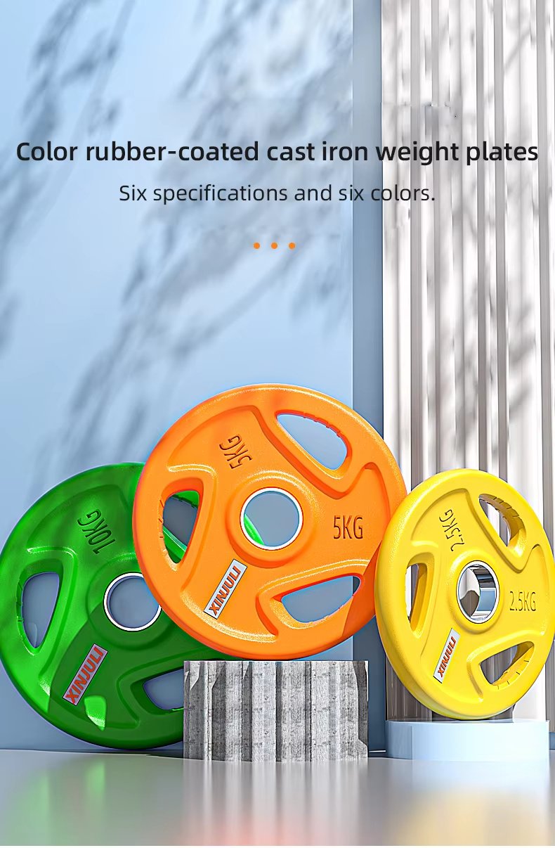 Colored rubber-coated cast iron weight plate, one-piece steel core, rubber + solid cast iron, anti-slip design. Rubber material, polyurethane rubber, environmentally friendly and odorless.