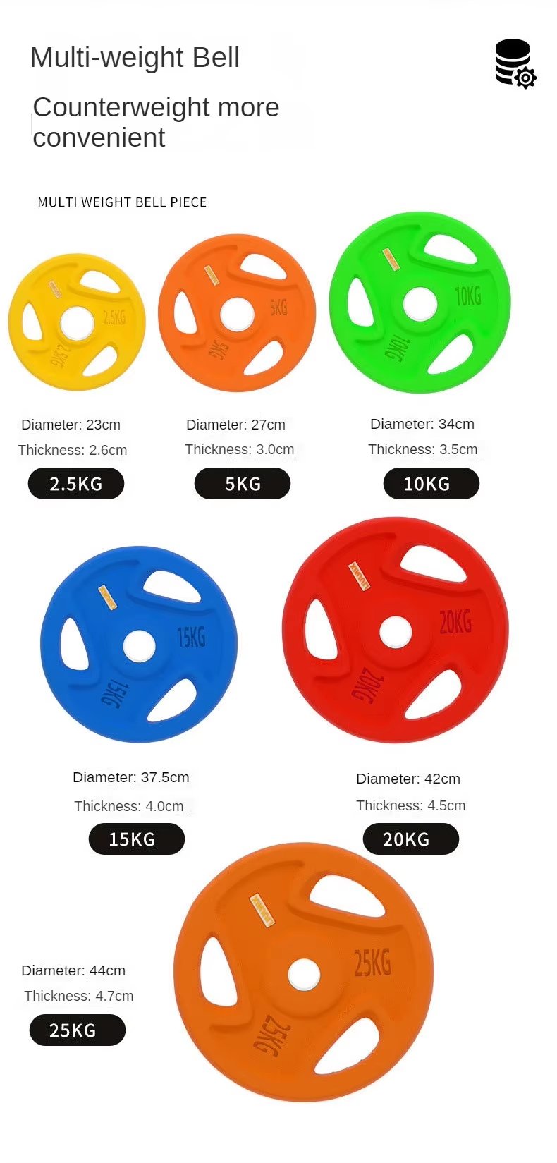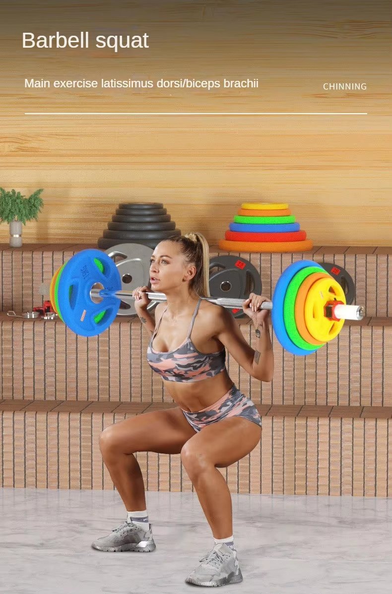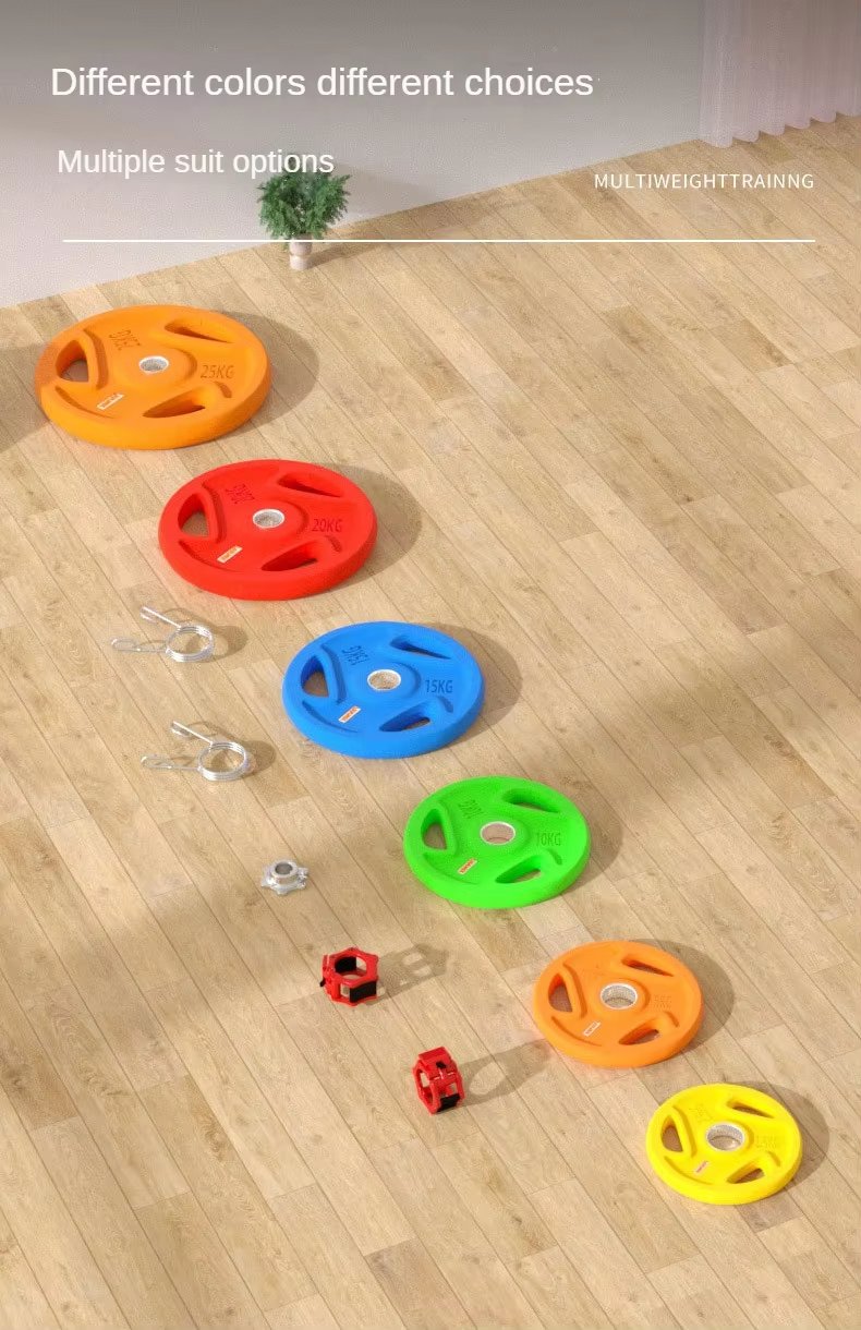 Feature Highlights:Colored rubber-coated cast iron weight plate, one-piece steel core, rubber + solid cast iron, anti-slip design. Rubber material, polyurethane rubber, environmentally friendly and odorless. Different colors, different specifications, multiple suit options. Used with barbell bars, multi-functional equipment, etc., it is suitable for various combination training and multi-weight training. The reinforcement is not loose and the weight is safer.