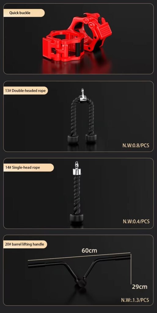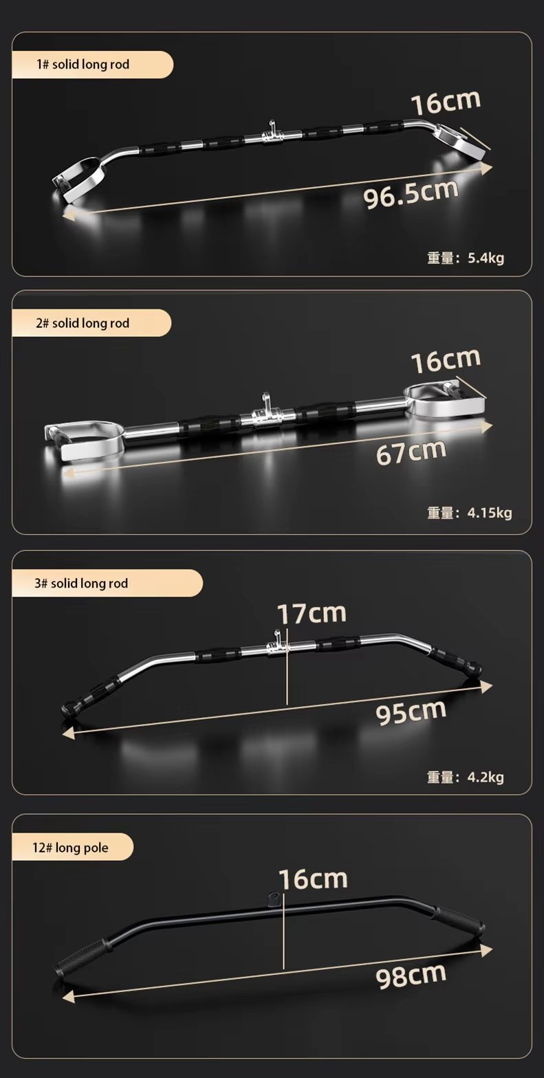 Feature Highlights:Professional gym accessories, solid iron, high quality, multi-purpose, safer and more comfortable. The handle adopts a particle design to increase friction and prevent slipping more effectively. It can be rotated 360° and is of commercial high quality. Categories include short poles, solid long poles, long poles, triceps attachment points, D-shaped handles, pull-down handles, quick buckles, double-ended ropes, single-ended ropes, barrel lifting handles, etc.