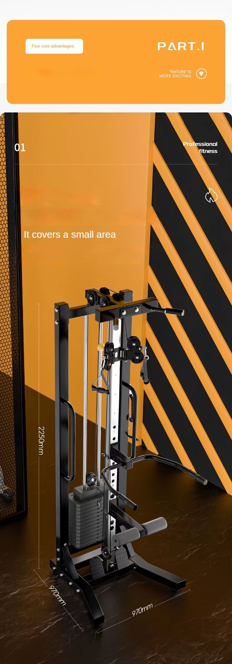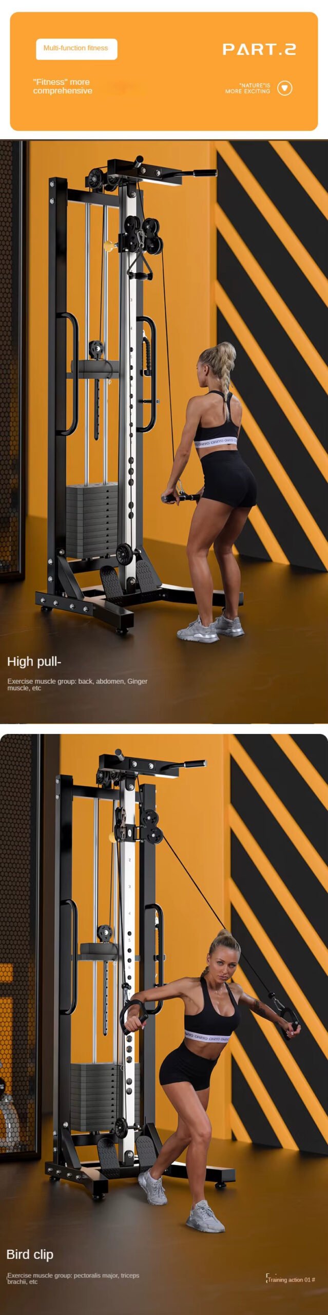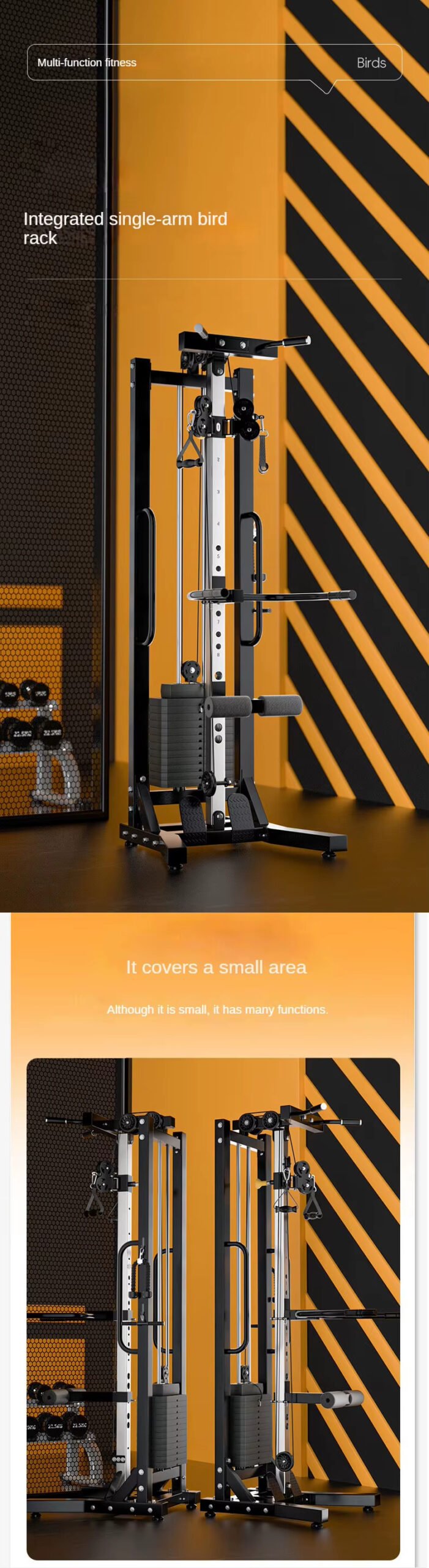 Integrated single-arm bird stand for multi-functional fitness. The upper limit of the load-bearing capacity is about 500 kilograms. It is equipped with multi-functional components and can be combined freely to realize various exercise methods such as high pull-down, chest fly, standing rope leg extension, parallel bar extension, rope rowing, etc.