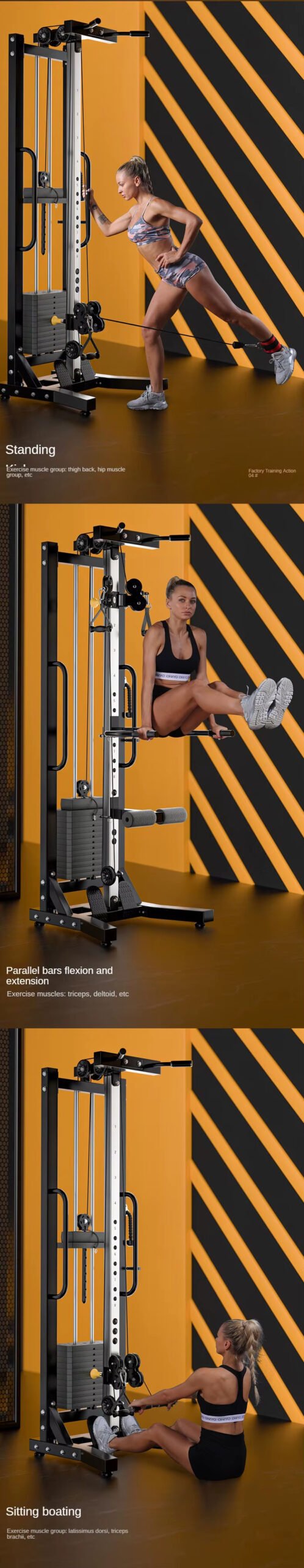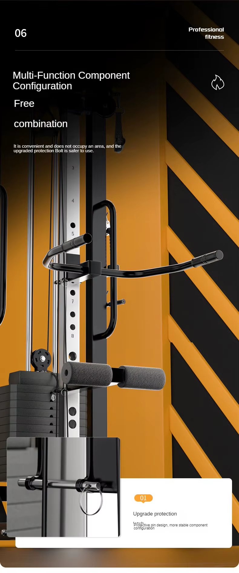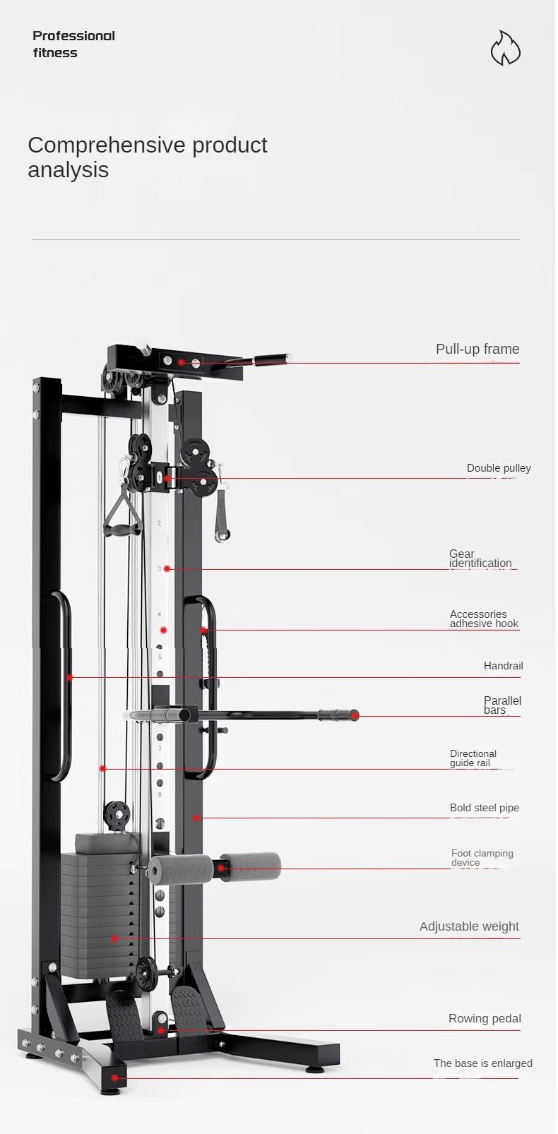 Integrated single-arm bird stand for multi-functional fitness. The upper limit of the load-bearing capacity is about 500 kilograms. It is equipped with multi-functional components and can be combined freely to realize various exercise methods such as high pull-down, chest fly, standing rope leg extension, parallel bar extension, rope rowing, etc.