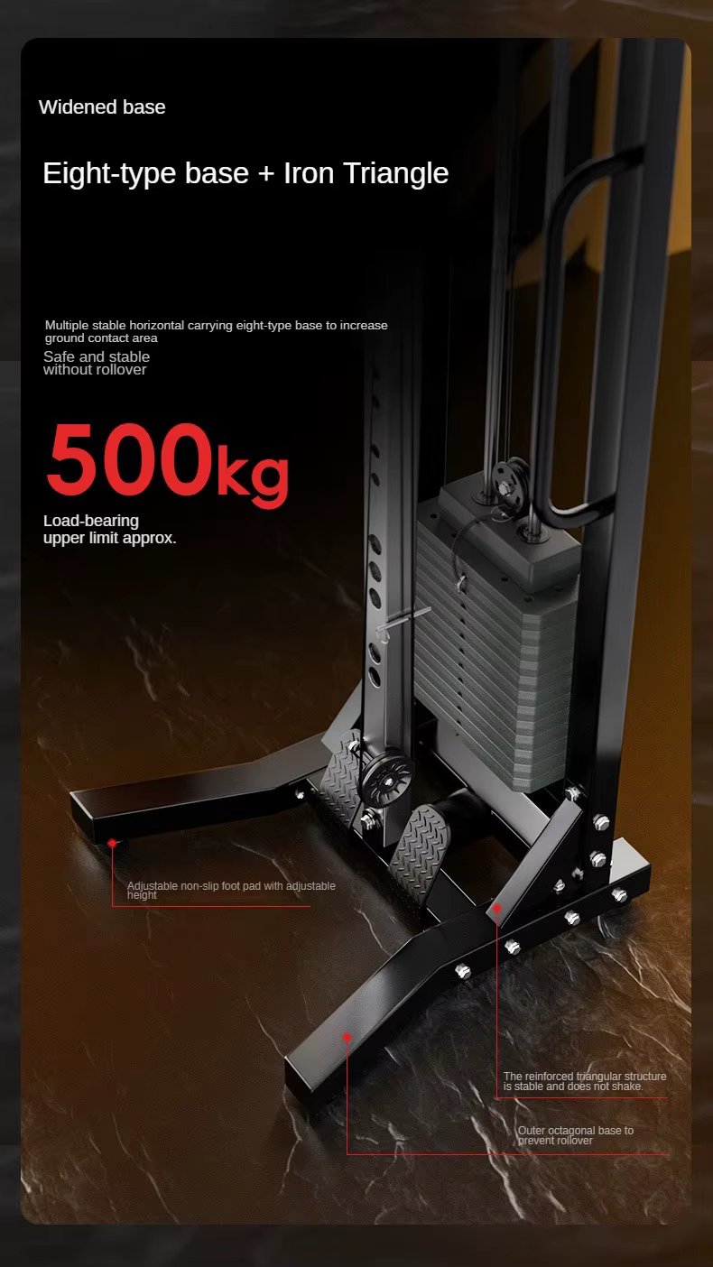Feature Highlights:The all-in-one single-arm bird stand occupies a small area, but it has many functions to achieve multi-functional fitness. It is equipped with a pull-up frame, double pulleys, gear adjustment marks, accessories hooks, parallel bars for handrails, directional guide rails, thickened steel pipes, presser foot device, adjustable weight, rowing pedals and other functional devices. The base is enlarged, with a figure-shaped base + iron triangle, which is safe and stable without tipping over. The upper limit of the load-bearing capacity is about 500 kg. Thickened leg-clamping foam, multi-level adjustable leg style, multi-functional component configuration, free combination, to achieve a variety of exercise methods such as high pull-down, chest fly, standing rope leg extension, parallel bar extension, rope rowing, etc.
