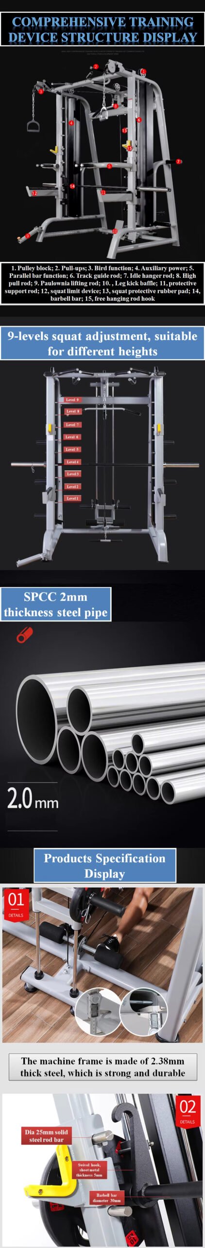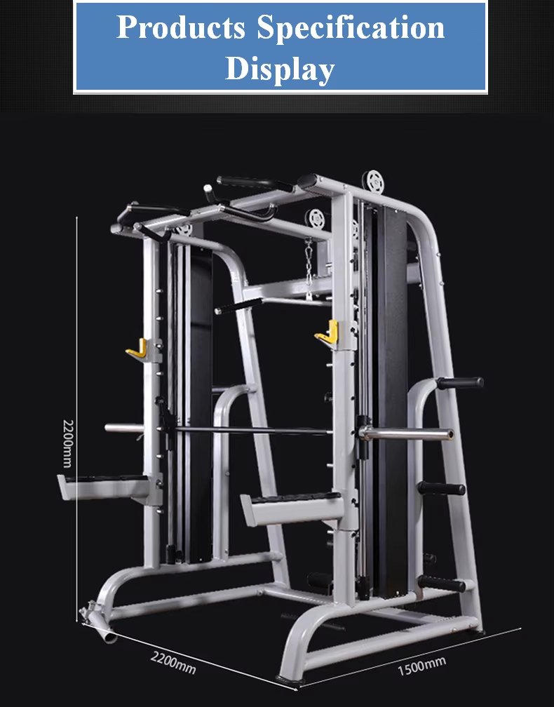 Feature Highlights:The multi-functional Smith training machine realizes full-body exercise with one machine: cable pull-down function, squat rack function, kick training function, back pull-down exercise function, barbell flat bench press, and seated rowing training. Equipped with pull-up rack, Smith squat, barbell hook, parallel bar device, long interval station, adjustable weight, spring limit frame, barrel device, rowing pedal, etc., it has various strength training functions to exercise the muscles of the whole body.