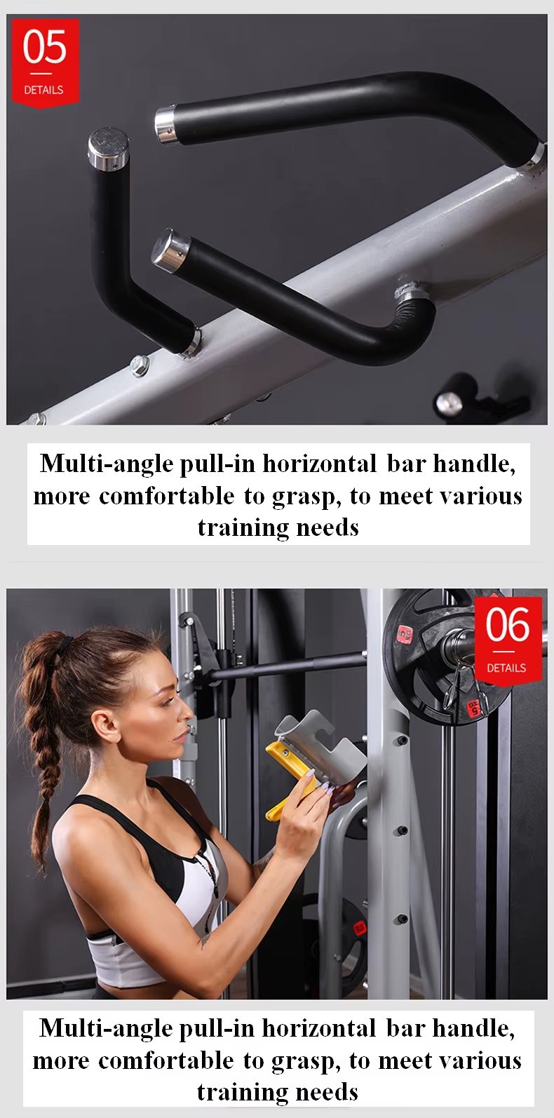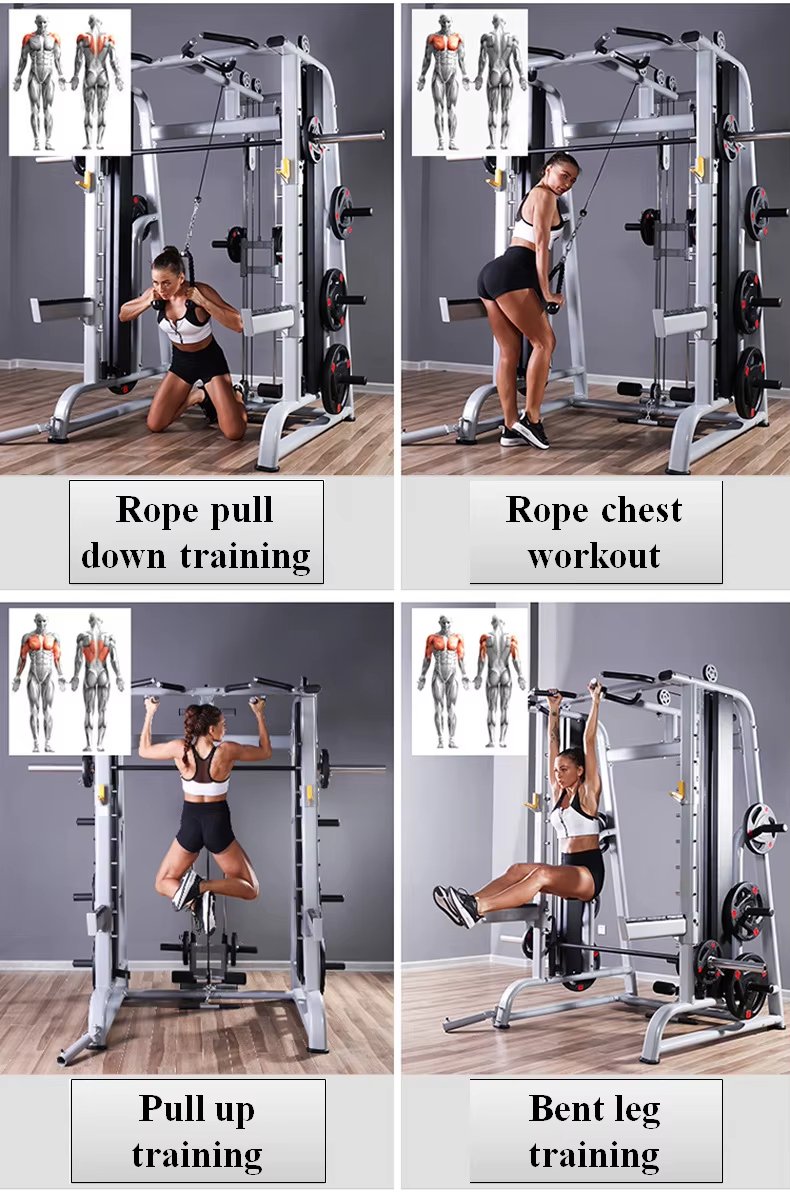 The multi-functional Smith training machine realizes full-body exercise with one machine: rope pull-down function, squat rack function, kick training function, back pull-down exercise function, barbell bench press, seated rowing training, one machine with multiple functions, training the whole body muscles.