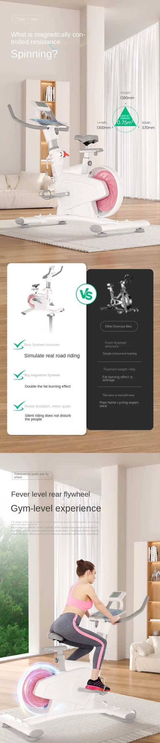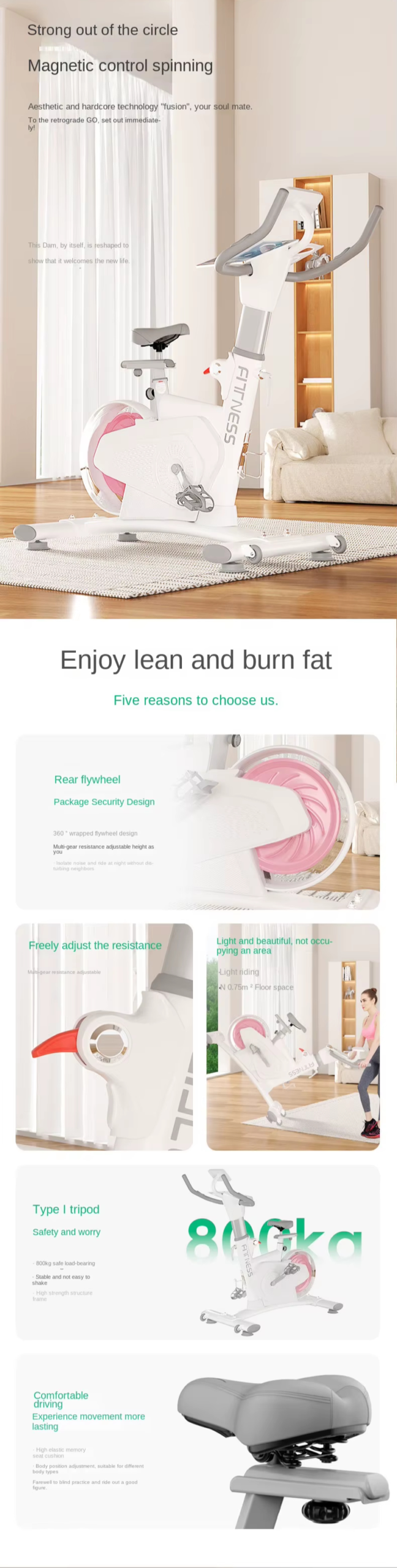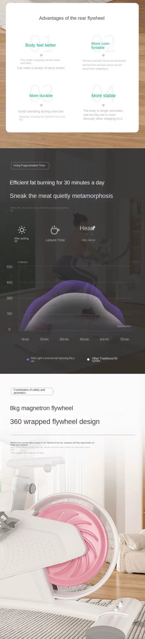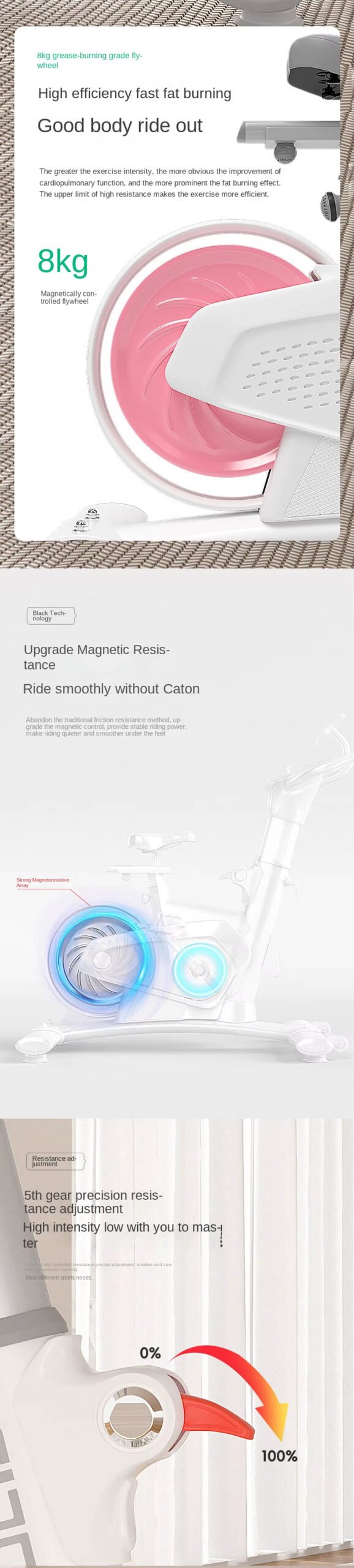 360° wrapped flywheel design, five-speed precise resistance adjustment, rear flywheel structure, 8kg magnetically controlled flywheel. L-shaped tripod, H-shaped support + iron triangle, easy to bear 800kg, Q-soft rebound cushion, comfortable driving, all-round monitoring data.