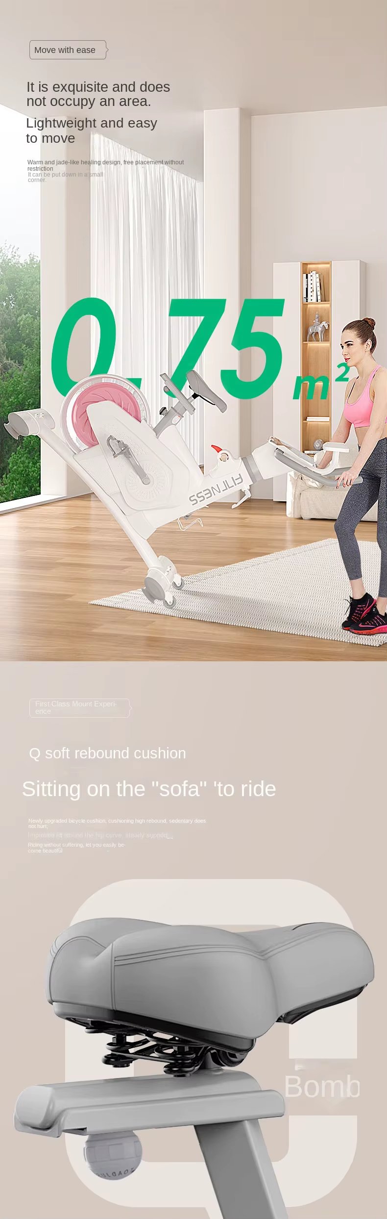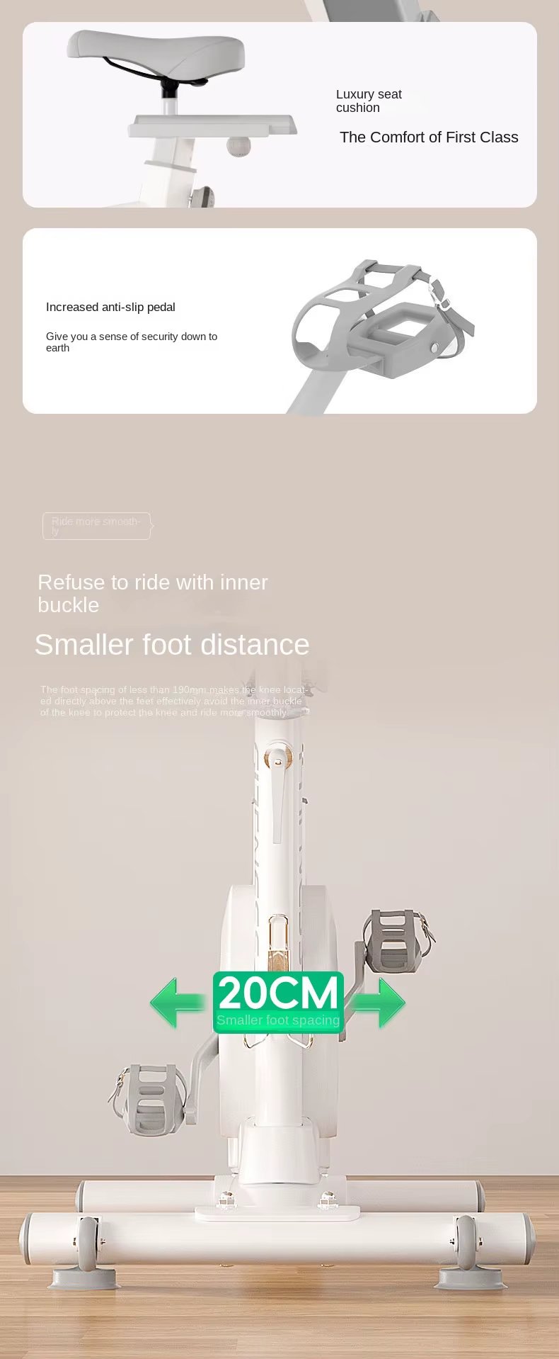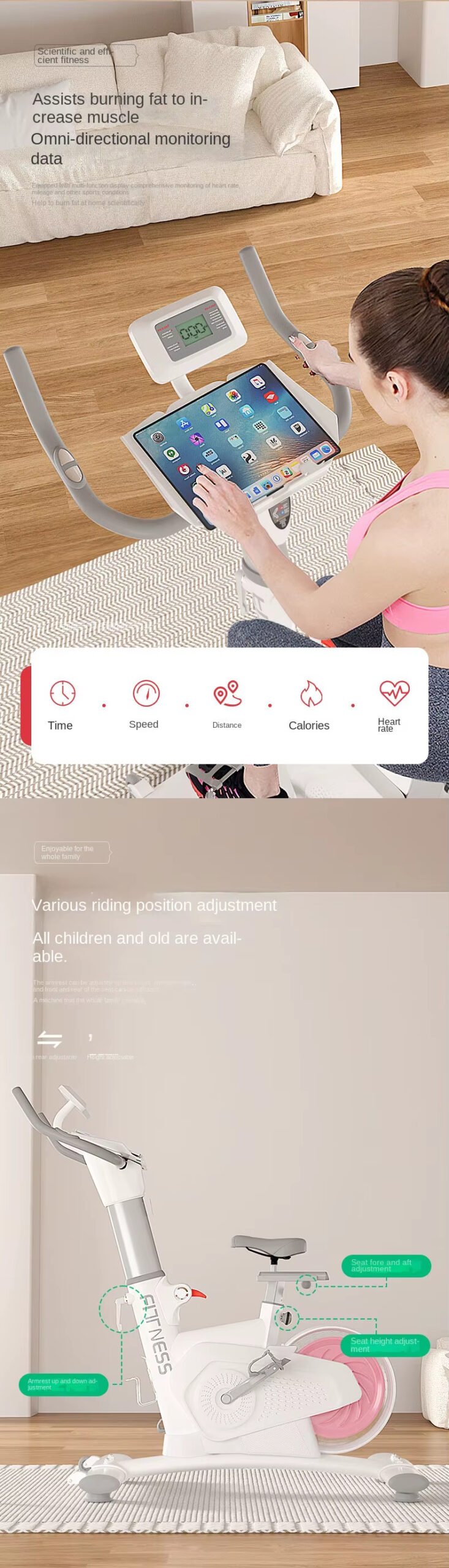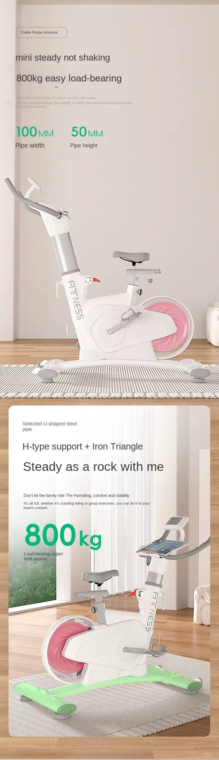 360° wrapped flywheel design, five-speed precise resistance adjustment, rear flywheel structure, 8kg magnetically controlled flywheel. L-shaped tripod, H-shaped support + iron triangle, easy to bear 800kg, Q-soft rebound cushion, comfortable driving, all-round monitoring data.