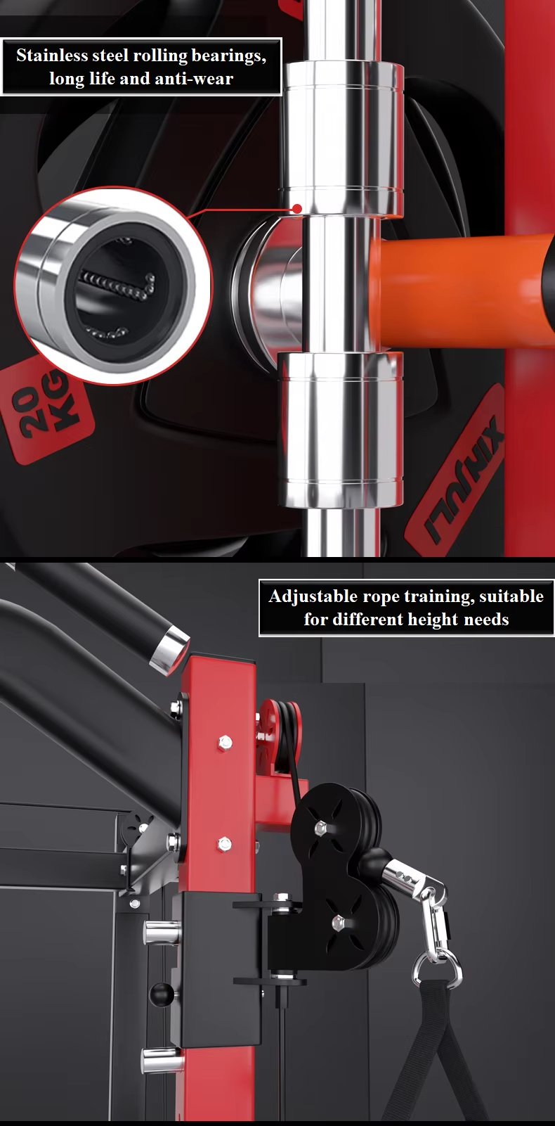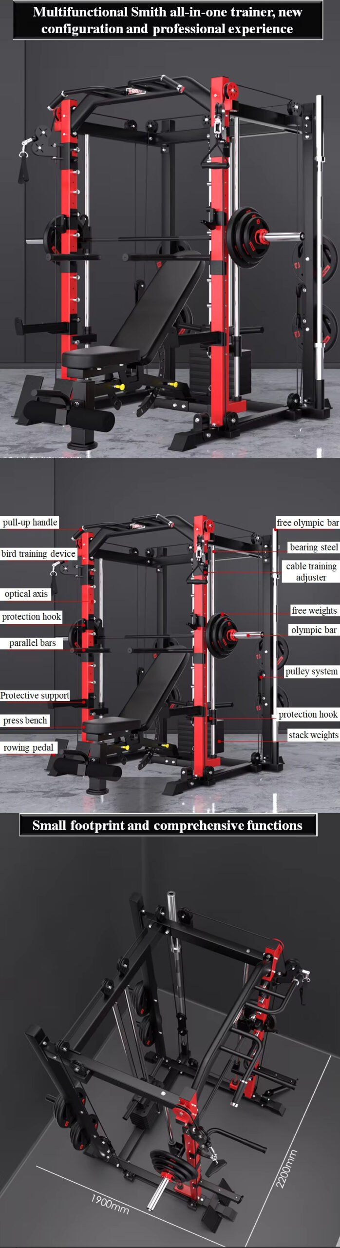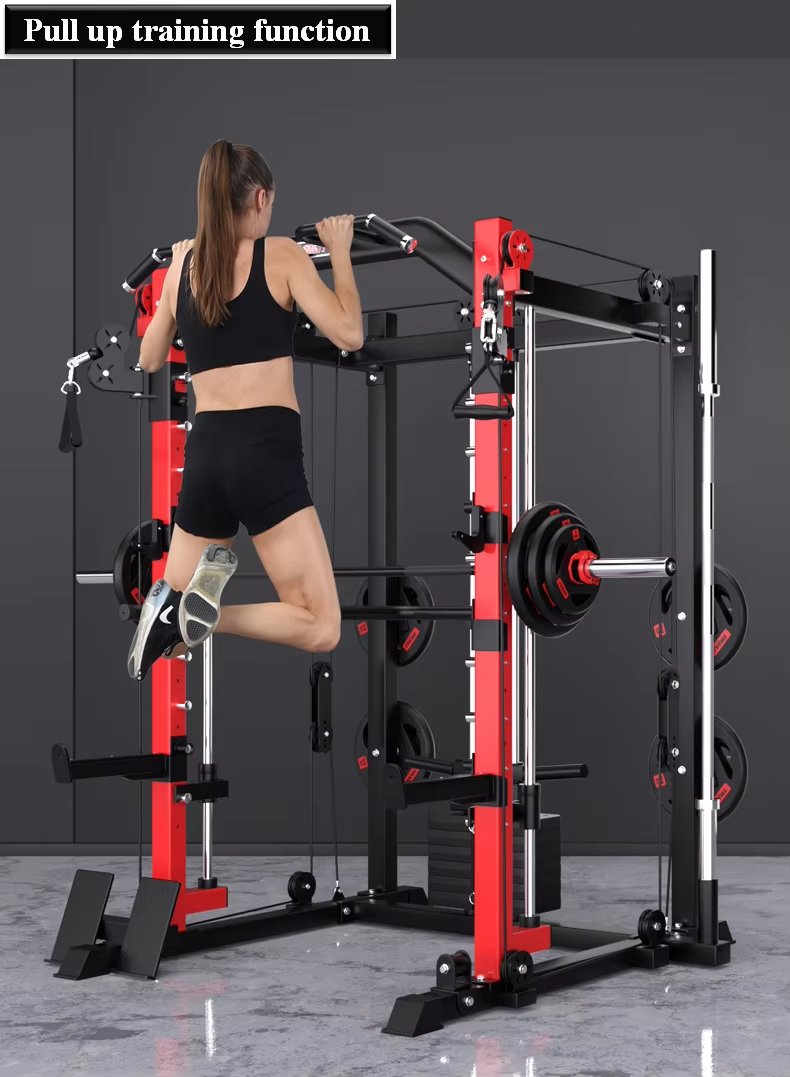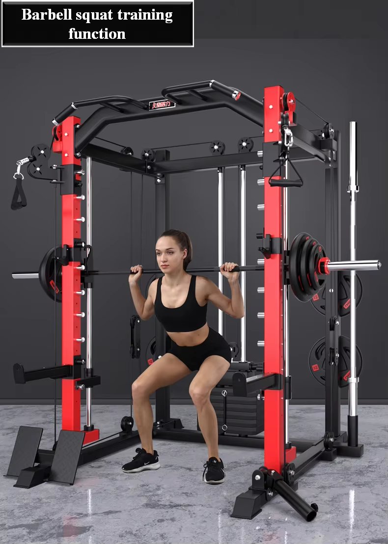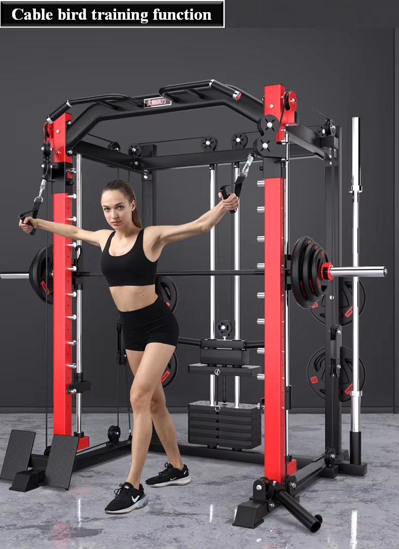 Feature Highlights:Multifunctional Smith all-in-one trainer, new configuration, professional experience. It occupies a small area and has comprehensive functions. 10 levels of adjustment, adjustable rope, suitable for different heights. Rope bird training function, pull-up training function, barbell squat training function, straight-arm parallel bar training, pull-up suspension training, high pull-down training, rope press training, free deadlift training, free squat training, seated rowing training, free squat training. Using stainless steel rolling bearings, long life and anti-wear.